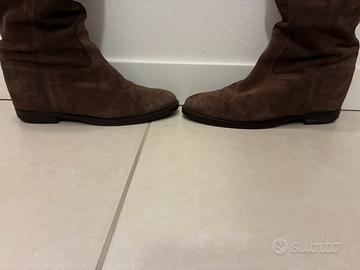 Stivale in camoscio con V oro liscia e zeppa interna di 3,5 cm. Vendo con scatola originale e sacchetto antipolvere originale.