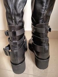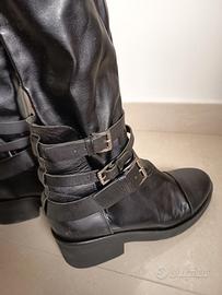 stivale in ecopelle elastico nero con fibbie alla caviglia . design moderno per dare un tocco di stile al tuo outfit . versatili e alla moda sono adatti siai ad un look casual che elegante .si possono portare sia alti al ginocchio che bassi e un po' morbidi. ottime condizioni unico difetto sono graffiati dietro alla caviglia ,controlla foto. prezzo originale 265€