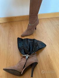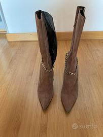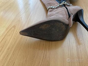 Vendo stivali vintage originali del 2000, marca VICINI, in morbido scamosciato rosa cipria, con punta affusolata e tacco a spillo sottile.