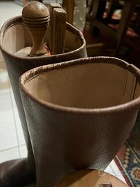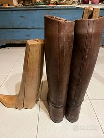 Stivali alti in pelle marrone, stile classico da cavallerizza con punta arrotondata e completi di tendistivali artigianali in legno.