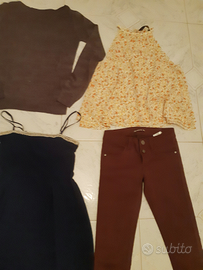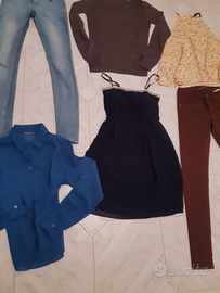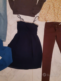 Stock abbigliamento donna 6 pezzi composto da: 1 jeans terranova tg xxs 1 pantalone terranova tg xxs 1 maglioncino grigio scuro terranova tg xs 1 camicia bluette tg xs terranova 1 blusa a fiorellini tg sc zara 1 vestitino blu tg xs Usato in ottimo stato
