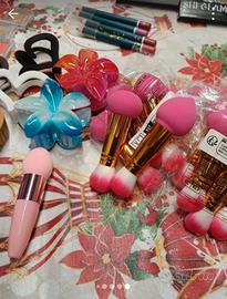 dispongono di stock circa 130 pezzi per rivendita pennello,spugnetta per trucco,spugnette struccanti,pinzette sopracciglia,pinza x capelli,matita labbra, ombretti, pennello e spugna,bordello porta trucco, confezione di 4spugne