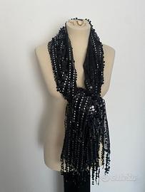 Stola sciarpa elegante, in tessuto semi trasparente tipo tulle e con paillettes di forma tonda nere-argento, ideale come coprispalle su un abito elegante per un'occasione speciale, come una cerimonia o una serata fuori. Materiale: 50% acrilico e 50% poliestere. Dimensioni: lunghezza 177 cm, larghezza 63 cm, lunghezza frange 10 cm. Nuova con cartellino.