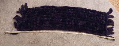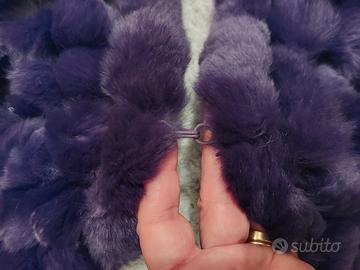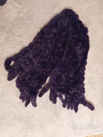 Bellissima stola in vera pelliccia di lapin, con gancio per chiusura, e frange a codine, molto morbida al tatto, di un colore sfumato viola da più scuro a chiaro. Lunghezza totale comprese le frange 140 cm e larga 36 cm.