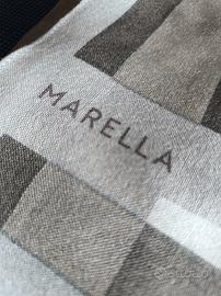 Stola per spalle e collo, leggerissima in pura lana 100%, con disegni geometrici azzurro carta da zucchero, tortora e grigio.