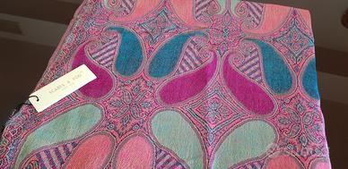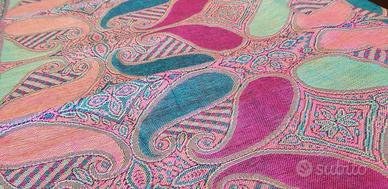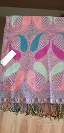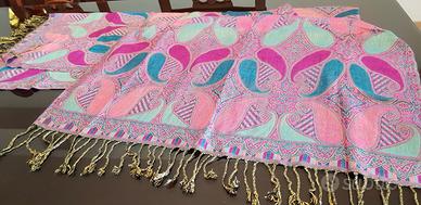 Stola donna nuova con cartellino. Tessuto misto viscosa,morbida e leggera. Fantasia cashmere/paisley nei toni rosa, turchese verde acqua. Lunghezza circa 176 cm con frange. Ideale per primavera/estate o come accessorio elegante. Mai utilizzata.