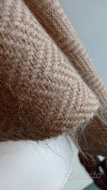 Esclusiva stola realizzata su telai d'epoca con l'iconico motivo a spina di pesce. Il tessuto è un pregiato intreccio di lane naturali non tinte ("lane more") e lana vergine, che conferisce al capo una consistenza ricca e materica. Il design è impreziosito lungo i bordi da morbidi elementi a nappa dall'effetto vellutato, che donano un movimento tridimensionale e un'eleganza sofisticata. Un pezzo d'archivio raro, perfetto per chi cerca un accessorio dal fascino autentico e artigianale.Motivi in visione ne esaltano la bellezza
