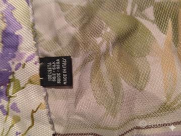 Elegante stola firmata Valentino, un accessorio di lusso ideale per completare outfit da cerimonia o per elevare un look quotidiano. La raffinata stampa botanica con fiori di glicine nei toni del lilla e del verde oliva su fondo avorio la rende un pezzo sofisticato e senza tempo. Materiale: 100% Seta (Made in Italy). Dimensioni: 175 cm x 65 cm (Formato stola lunga). Dettagli: Bordo rifinito color lilla pastello, logo Valentino integrato nella stampa e etichetta di composizione originale presente. Condizioni: Ottime, tessuto fluido e lucente, colori vividi. Grazie alle sue dimensioni generose, è perfetta da indossare come coprispalle per un evento o annodata in stile parigino. 021