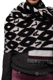 Sciarpa Stola Foulard di Valentino, crema e nero con orlo sfrangiato, stampa con fantasia geometrica, logo intarsiato e design lavorato a maglia.