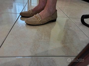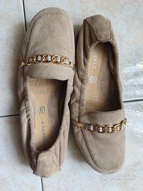 Mocassino Stonefly n°37, in pelle scamosciata, colore beige, soletta in vera pelle, tacco 2 cm. In buone condizioni, provviste della scatola originale. Per ulteriori informazioni scrivetemi pure.