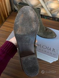 Stivaletti donna Camperos in pelle scamosciata color verde/grigio, modello texano/boho, con tacco comodo legno.