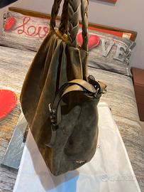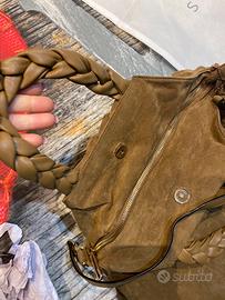Bellissima borsa, effetto scamosciato, manico in simil pelle intrecciato,