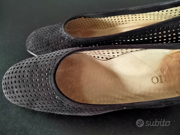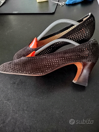 Bellissimo modello Lario in pelle scamosciata traforata colore marrone scuro, suola interna in pelle. Elegante tacco h.7 cm.