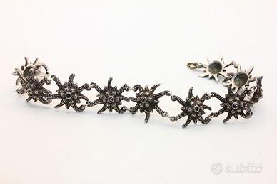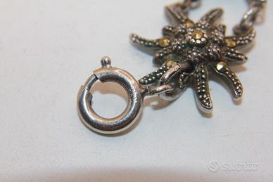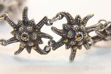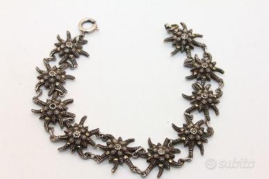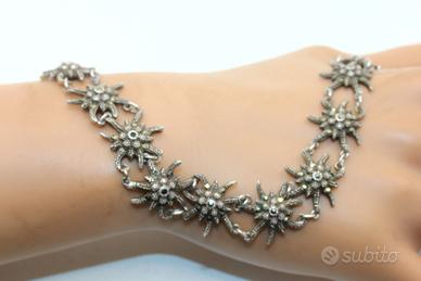 Questo incantevole bracciale è un tributo alla gioielleria tradizionale europea, caratterizzato da un design naturalistico di rara bellezza. Il gioiello è composto da una serie di maglie snodate, ognuna delle quali riproduce con minuziosa cura la forma di una stella alpina (Edelweiss), simbolo di purezza e rarità. Realizzato in argento titolo 835, il metallo è stato sapientemente brunito per creare un contrasto profondo che mette in risalto la lucentezza delle pietre. Il vero protagonista di questo pezzo è l'abbagliante pavé di marcasiti a taglio brillante, incastonate su ogni singolo petalo e al centro di ogni fiore. Queste pietre, amate nella gioielleria vintage per la loro capacità di riflettere la luce con un bagliore metallico discreto ed elegante, conferiscono al bracciale una luminosità magnetica. La struttura è solida ma flessibile, garantendo un comfort eccezionale una volta indossato, mentre la chiusura a molla originale assicura una tenuta perfetta. Con un peso di 17,5 grammi e una larghezza di 17 mm, il bracciale ha una presenza importante sul polso senza risultare eccessivo. I punzoni dell'argento, visibili sulla chiusura, ne certificano l'autenticità e la qualità dei materiali. È un accessorio perfetto per chi desidera un tocco di eleganza retrò, ideale sia per occasioni speciali che per arricchire un outfit quotidiano con un dettaglio di classe intramontabile.