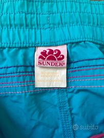 Bellissimo costume da mare Sundek, originale, taglia M/42 modello classico con arcobaleno. Colore azzurro, striscia laterale fucsia. Logo ricamato sulla tasca sinistra. Tessuto leggero e resistente, ad asciugatura rapida. Usato 3-4 volte. Zona piazza Carlo terzo, Napoli