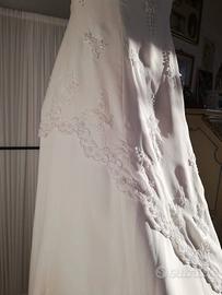 E' composto da 3 strati di seta più un quarto strato superiore trasparente tutto ricamato con perline bianche e perline iridescenti. Lungo con coda, veste fino alla taglia 44/46 (nella zona bacino veste anche fino alla 46), La taglia del seno è una 34 coppa C (ossia una quarta, ma con busto piccolo, circa 90/95 cm di circonferenza seno).