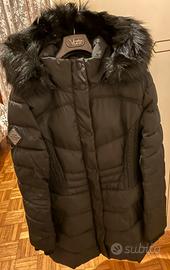 Giaccone donna Superdy nero, slancia la figura e delinea le forme. In foto sembra molto piu “pesante” di come stia indossato. Misura L (una 44 circa) , molto caldo , cappuccio con pelo. Stile elegante e sportivo, a seconda degli abbinamenti. Un ottimo affare, e’ tenuto benissimo, non ha segni o difetti.