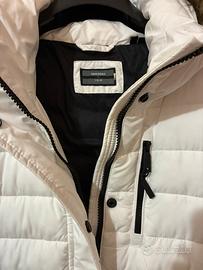 Giaccone donna, bellissimo, senza alcun difetto, molto caldo, bianco ottico con zip e dettagli neri, cappuccio. Molto bello indossato, abbraccia la silhouette, versatile ed indossato pochissimo.
