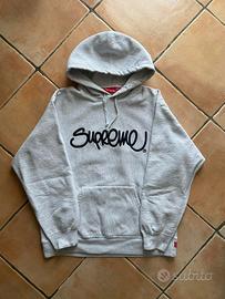 Vendo felpa con cappuccio Raised Script grigio avena Supreme originale usata ma in ottimo stato, ampiezza spalle 52, lunghezza (misura dalla parte superiore della scollatura senza cappuccio fino all'orlo inferiore) 69.