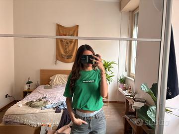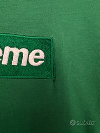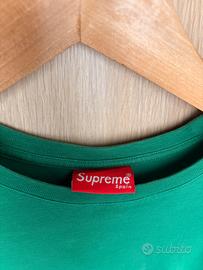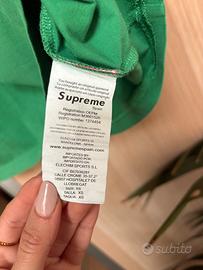 T-shirt 100% cotone di Supreme verde, con logo ricamato sul davanti, in perfette condizioni, presenta solo un piccolo foro vicino al logo come mostrato in foto, poco evidente, t-shirt originale praticamente nuova
