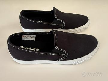 Vendo comodissime sneakers slip-on da donna originali Timberland in tela nere con suola bianca. Un modello super pratico e versatile, perfetto per la primavera e l'estate. Si infilano e sfilano in un secondo, grazie agli inserti elastici laterali sono molto comode perfette per tempo libero per un look casual chic. Sono praticamente state indossate per pochi passi in quanto sfortunatamente non posso più utilizzare calzature sneakers basse. In pratica sono nuove.