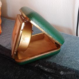 Orologio sveglia carica a molla pieghevole da viaggio vintage modello 2 Jewels prodotto da Veglia. Realizzato in metallo dorato con cofanetto plastificato di colore verde.Orologio funzionante e in buone condizioni