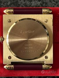 Vendo splendida penduletta/sveglia da viaggio, icona del design Cartier anni '80 - '90. Batteria esaurita. Oggetto elegante e raffinato, pensato come orologio e sveglia da viaggio di alta gamma, con il classico quadrante minimalista e numeri romani tipici della Maison. Nuova, mai usata. Misure: larghezza 2,9 - profondità 1,9 - h 3,3 cm ✨ Caratteristiche Modello: Must de Cartier Travel Clock / Pendulettes. Cassa pieghevole, placcata oro con finiture metallo e dettagli blu. Quadrante bianco con numeri romani e corona con cabochon blu. Movimento quarzo Cartier. Realizzata in Svizzera. Design compatto da viaggio 📦 Dotazione completa (full set) Scatola originale Cartier rossa Custodia interna in velluto Libretti e certificati originali Documentazione internazionale di garanzia 📌 Condizioni Oggetto conservato con cura, mai utilizzato. Astuccio esterno perfetto. Oggetto originale.
