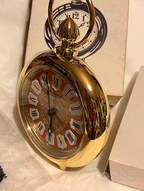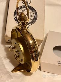 Bella e rara sveglia prodotta da Blessing werke(west germany) sul finire degli anni 70 con particolare forma di orologio da taschino!Presenta un favoloso quadrante metallizzato cangiante rosso con cifre romane a rilievo,punti ora e lancette con vernice fosforescente al buio;copriquadrante in plastica trasparente in ottimo stato.Scocca dorata LUCIDA perfetta,senza ammanchi,sul retro movimento con due chiavette e manopole originali.Altezza circa 17 cm,larghezza massima circa 12 cm.Box di 17,5x11x6,5 cm.Peso 320 grammi.Box originale dedicato ,sveglia ben funzionante,acquisto as is visto e piaciuto come per ogni transazione tra privati senza reso ne’ garanziaDisponibili diverse unita’ ed in altra inserzione varianti dorata satinata e nichelata dello stesso modello!.Prezzo per singola sveglia.