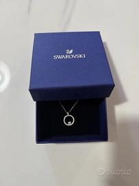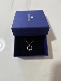 vendesi collana originale swarovski della collezione constella (o creativity), con pendente a cerchio aperto tempestato di cristalli pavé chiari e un piccolo cristallo posizionato all’interno (effetto halo delicato). catena in metallo silver-tone (rhodium plated) con chiusura regolabile. la collana è mai usata, conservata sempre nella sua scatola originale blu swarovski. cristalli luminosi e perfetti, catena senza alcun segno, sembra appena uscita dal negozio. perfetta per look minimal, everyday o da layering con altre collane. un gioiello elegante e scintillante che dona luce al viso. dettagli: • brand: swarovski • collezione: constella / creativity • pendente: cerchio aperto con cristalli pavé + cristallo interno • materiale: metallo silver-tone con cristalli swarovski