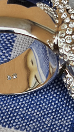 È placcato Rodio. Ha un grosso cristallo trasparente con taglio a smeraldo.