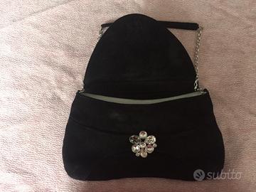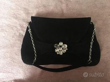 Swarovski borsa da sera di camoscio nero con fermaglio gioiello e tracolla media.