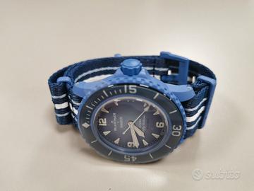 Questo orologio Blancpain X Swatch rende omaggio al Fifty Fathoms di Blancpain, il primo vero orologio subacqueo.