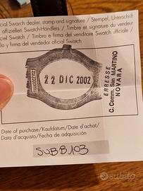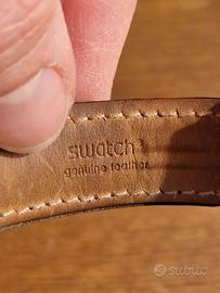 Swatch Chrono SCB111 "Lodge", prodotto nel 1993. Questo modello vintage è caratterizzato da un quadrante con numeri romani e un cinturino in pelle marrone, in ottimo stato e unisex. Funzionante, pulendo cambiate oggi in gioielleria che ha fatto un Ceck-up per determinare il funzionamento ottimale.Nella sua confezione originale (un pò ammaccata dal tempo) ma l'orologio in sé è ancora in ottimo stato, come il cinturino in pelle.