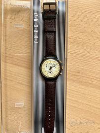 Vendo con scatola e garanzia dell’epoca. Usato pochissimo, non più di tre-quattro volte. 38 mm. Il cronografo non resetta bene, problema comune ai quarzi che non vengono usati per molto tempo. Pila nuova. Quando si esaurirà qualsiasi rivenditore Swatch la sostituirà gratis.