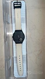 Vendo Swatch Chrono nuovo mai usato con la sua scatola originale. L'orologio è nero con delle cuciture azzurre sul cinturino in pelle. Il quadrante è argento e funziona bene. É un modello svizzero di qualità e molto leggero da portare. È resistente all'acqua, quindi puoi usarlo senza pensieri ogni giorno.