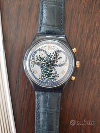 Swatch chrono Timeless Zone, originale, cinturino in vera pelle blu. Usato in buone condizioni. Da sostituire la batteria. Resta inteso che essendo un oggetto degli anni '90 non esiste garanzia del funzionamento successivamente all'acquisto così come non può esser garantita l'integrità del cinturino, con esclusione di ogni responsabilità del venditore.