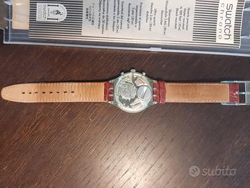 Swatch Chrono originale, modello Tyrone con cinturino originale in vera pelle. Usato ma in buone condizioni, da sostituire batteria. Resta inteso che essendo un oggetto degli anni '90 non esiste garanzia del funzionamento successivamente all'acquisto così come non può esser garantita l'integrità del cinturino, con esclusione di ogni responsabilità del venditore.