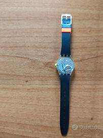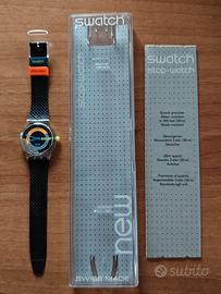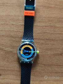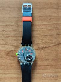 Un vero classico dei primi anni 90! Corpo trasparente Quadrante nero con accenti gialli/arancioni Il logo “STOP” sul vetro è un must Bracciale originale con clip colorati Anno di produzione 1991 – ricercato e raro Con scatola originale e certificato di garanzia – Ottimo stato vintage! Must-Have per collezionisti e fan di Swatch