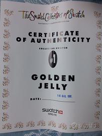 Vendo Swatch Golden Jelly Limited Edition Collector's Club. Orologio N.O.S., vintage, nuovo in scatola ,mai aperto, con certificato di autenticità dell'epoca (1991). Prezzo non trattabile. Eventuali spese di spedizione a carico dell'acquirente. No perditempo.