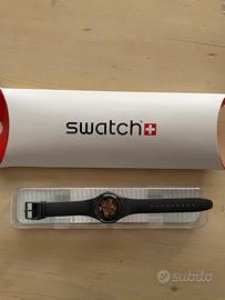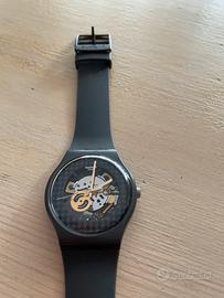 Swatch con quadrante grigio pied-de-poule con ingranaggi a vista. Cinturino in gomma. Indossato raramente. Completo di scatola e documenti.