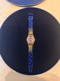Vendo Swatch Hocus Pocus funzionante, mai usato, con scatola originale. Anno di uscita 1998, tema magico/astrologico, quadrante con un grande sole stilizzato, cassa trasparente in plastica, cinturino in silicone blu con stelle dorate. Certificato di garanzia.