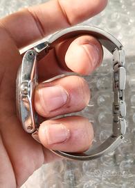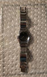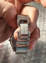 Orologio a batteria Swatch Irony del 1999 con movimento eta (svizzero). L'orologio funziona alla perfezione ed è molto bello con questo quadrante nerissimo. È completo di bracciale originale. L'unica pecca è il vetro plexiglass che è graffiato ed in controluce si vede, ma nel normale utilizzo non è fastidioso. Si potrebbe cambiare il vetrino perché c'è la lunetta che si smonta, però il problema è trovare il ricambio. 33mm di diametro, 38mm da ansa ad ansa, 10mm di spessore. 73.5gr di peso. Un piccolo lingotto di acciaio.