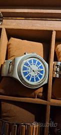 Vendo splendido Swatch Irony in alluminio, leggerissimo e dal design sportivo iconico degli anni 2000. L'orologio combina la resistenza della cassa metallica con un quadrante dinamico blu e argento a effetto "checkerboard".