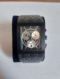 Parte della prestigiosa James Bond Collection realizzata da Swatch nei primi anni 2000, questo modello presenta l’iconica cassa rettangolare nera in stile Irony Chrono, con design grafico ispirato all’universo Bond.