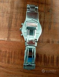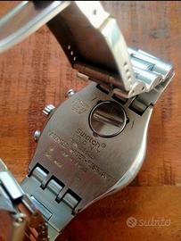 Articolo vintage collezione 1998 Perfettamente funzionante, batteria nuova Buone condizioni generali, piccolo segno su quadrante in prossimità del numero 12 • Impermeabile fino a 30 m (3 atm) • Precisione al quarzo • Diametro cassa 40 mm • Chiusura deployante • Confezione e documenti originali