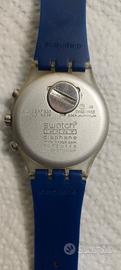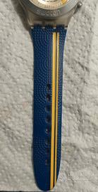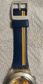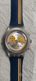 In vendita splendido e raro Swatch Irony Diaphane modello "Shaq 34" (Ref. SVCK4022P), edizione speciale dedicata alla leggenda NBA Shaquille O'Neal, lanciata nel 2004. Caratteristiche del pezzo: Design unico: Colori iconici dei Los Angeles Lakers (Giallo/Blu) con il numero 34 di Shaq e grafica "canestro" sul quadrante. Materiali: Cassa Diaphane (tecnopolimero trasparente) e lunetta in alluminio spazzolato. Leggerissimo al polso. Condizioni: L'orologio è perfettamente funzionante, incluso il cronografo (testato). Buone condizioni estetiche come da foto, cinturino originale dell'epoca ancora flessibile. Un pezzo immancabile per collezionisti Swatch e fan del basket americano