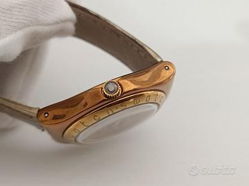 Cassa in metallo color bronzo, quadrante e sfere oro con numeri arabi; cinturino in pellecolor oro e fibbria metallica color bronzo.