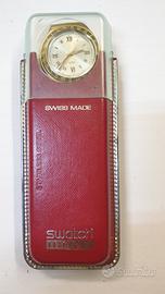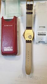 orologio Swatch irony Nuovo con scatola e documenti. cinturino in pelle marrone stampa coccodrillo , cassa e fibbia color oro , quadrante argento