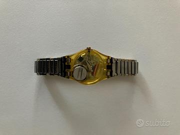 Orologio al quarzo da donna con cinturino elasticizzato in acciaio bicolore , cassa in plastica , anno 1994 . Funzionante , nella sua custodia originale con documento di acquisto , senza pila . Diametro quadrante mm. 25 . Usato .