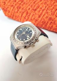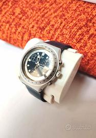 Swatch Irony chrono, modello YCS4012, Desperados 2, anno 1999. Cassa in alluminio e braccialetto in silicone blu che richiama il colore del quadrante. Leggerissimo da indossare. Perfettamente funzionante, come nuovo.